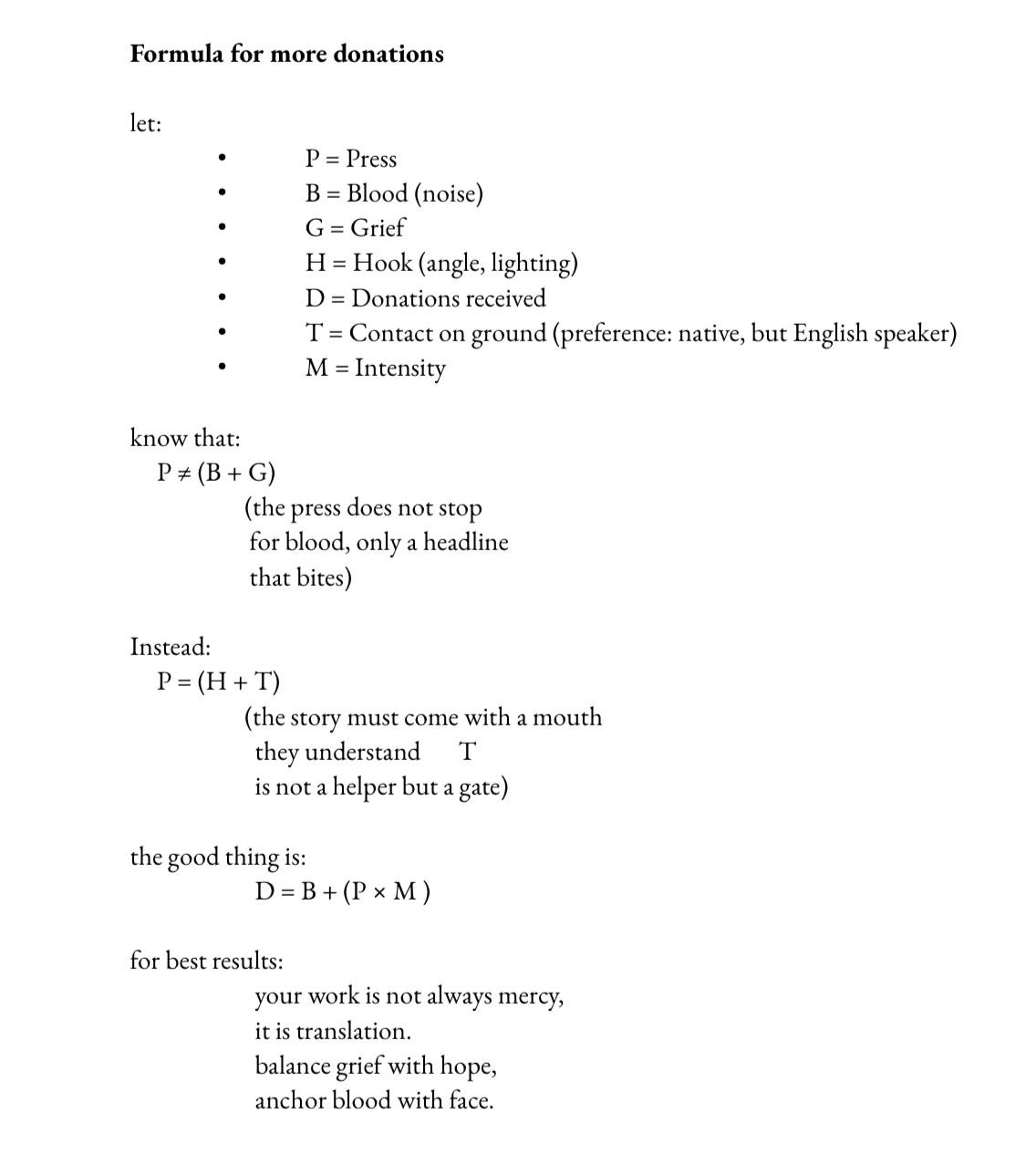 that the wind moves quicker than help. that windows are taught to shatter before they reflect. that a mother’s eyes can be an empty room. that the news cycle is always shorter than a funeral. that the cameras always (always) arrive late. that when they do, they ask for the light, the angles… ask for the English, never the blood. that silence is a privilege. that their skies do not rest, only reload. that there are children alive this morning that will be metaphors before noon. that right now, somewhere, a father is folding his daughter’s shadow into his arms, a boy trading his drawings for a shovel, learning the taste of ceiling dust because the sky broke open in his kitchen. because someone somewhere decided his house was close enough to a reason. that there is no logic to how one is picked. one child vanishes, another is scraped off a wall with a spoon. that there is a line for water. bad water. that a woman is baking bread in her sleep, sifting flour from bone. that when she wakes, there will be no flour. that the last bag was used to bury her girl. that grass is growing over IV lines, hospital walls. that a doctor is carrying a bag of teeth asking if anyone recognises the smile. that the convoy of aid will stop for coffee and sleep. that politicians will pretend ceasefires mean sending blankets for the dead, not the living. that this is not poetry, not essay, but inventory.